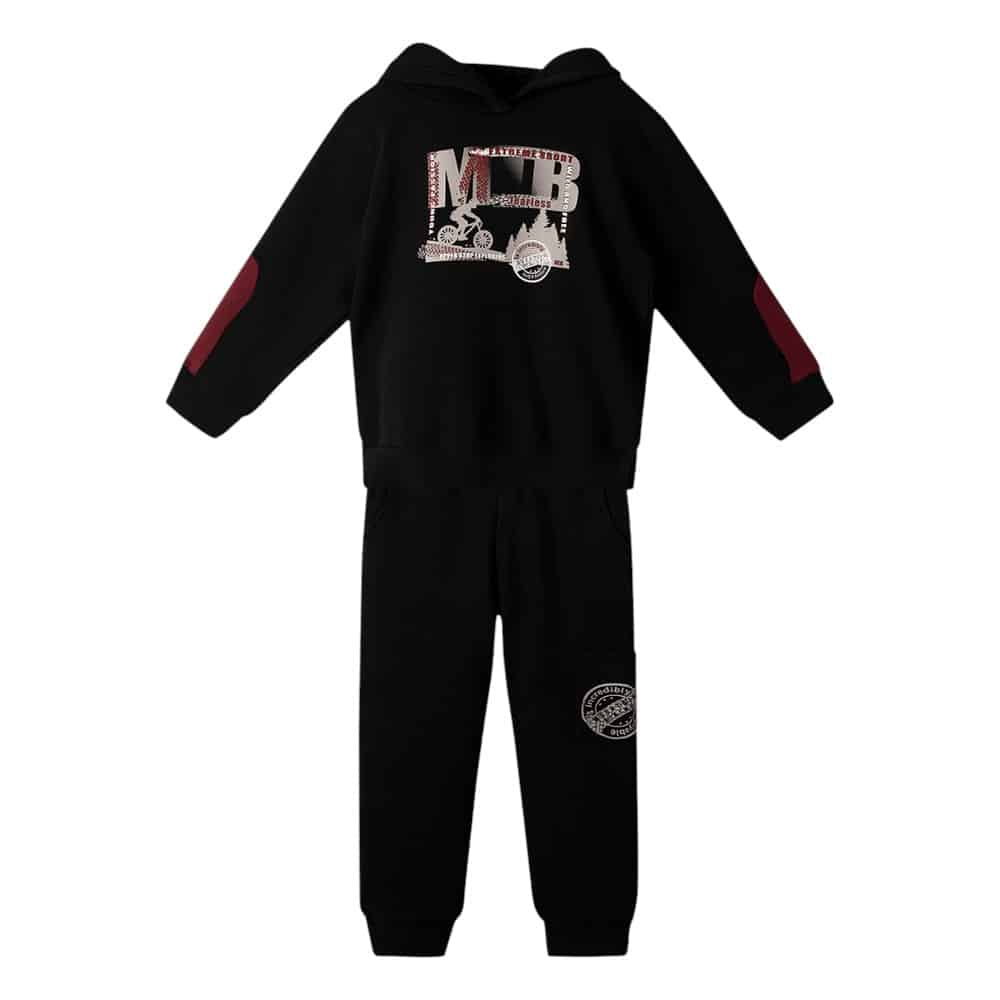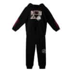 Σετ 2 τεμαχίων που αποτελείται από φούτερ μπλούζα  και φόρμα παντελόνι.  Φούτερ μπλούζα σε χρωμα μαύρο και τύπωμα στο μπροστινό μέρος, μανσέτες στα μανίκια και στο τελείωμα της μπλούζας. Μαυρο παντελόνι φόρμας με τσέπες, λαστιχο. Τα χρώματα είναι ανεξίτηλα. Πλένεται στο πλυντήριο στους 30OC.