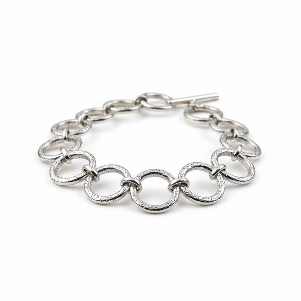Ένα γυναικείο βραχιόλι χεριού σε ασημί χρώμα με κρικάκια. Το βραχιόλι διαθέτει ένα ιδιαίτερο κούμπωμα που μπορεί να αυξομειωθεί το μάκρος του. Κατασκευασμένο από ανοξείδωτο ατσάλι, είναι υποαλλεργικό και κατάλληλο για καθημερινή χρήση, καθώς είναι ανθεκτικό σε νερό και αρώματα.